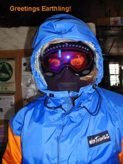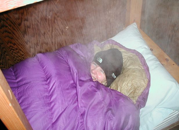 I found it amazing in this picture, that Cathy could be smiling. After all, it was 15 degrees Farenheit below zeow in this sleeping hut at the time of this picture. Jay kindly contributed his breath (the steam in the picture) to help illustrate the frigid temperature.